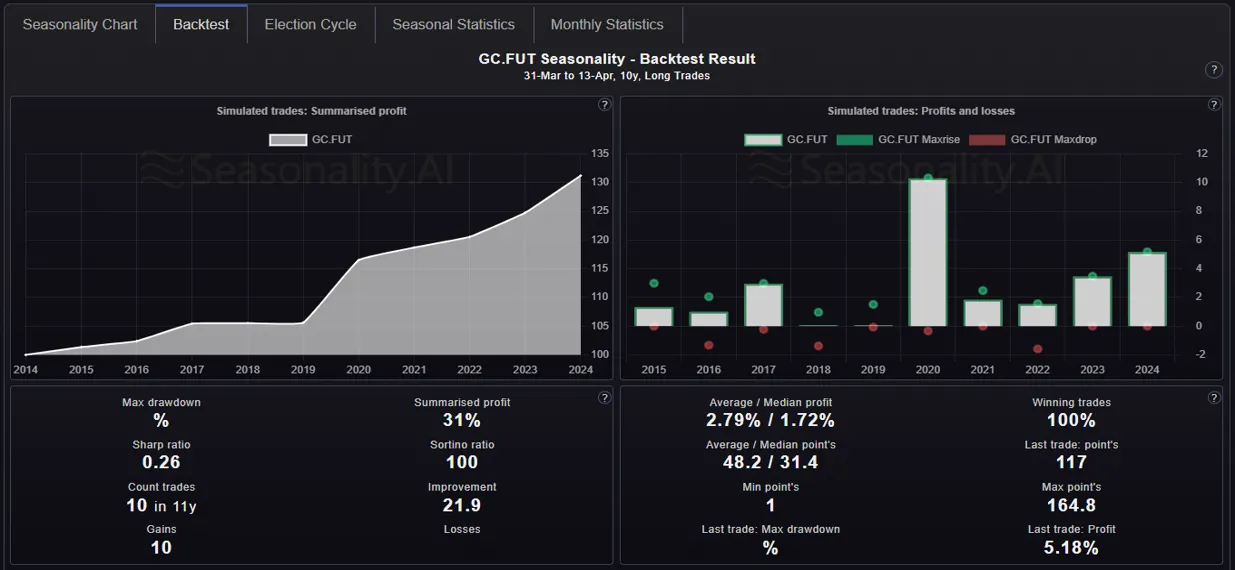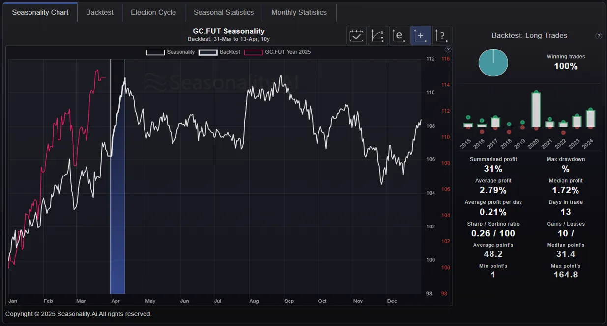 Over the past ten years, Gold has consistently moved higher during this exact time window every single year – a rare level of consistency that makes this pattern particularly attractive for seasonal traders.