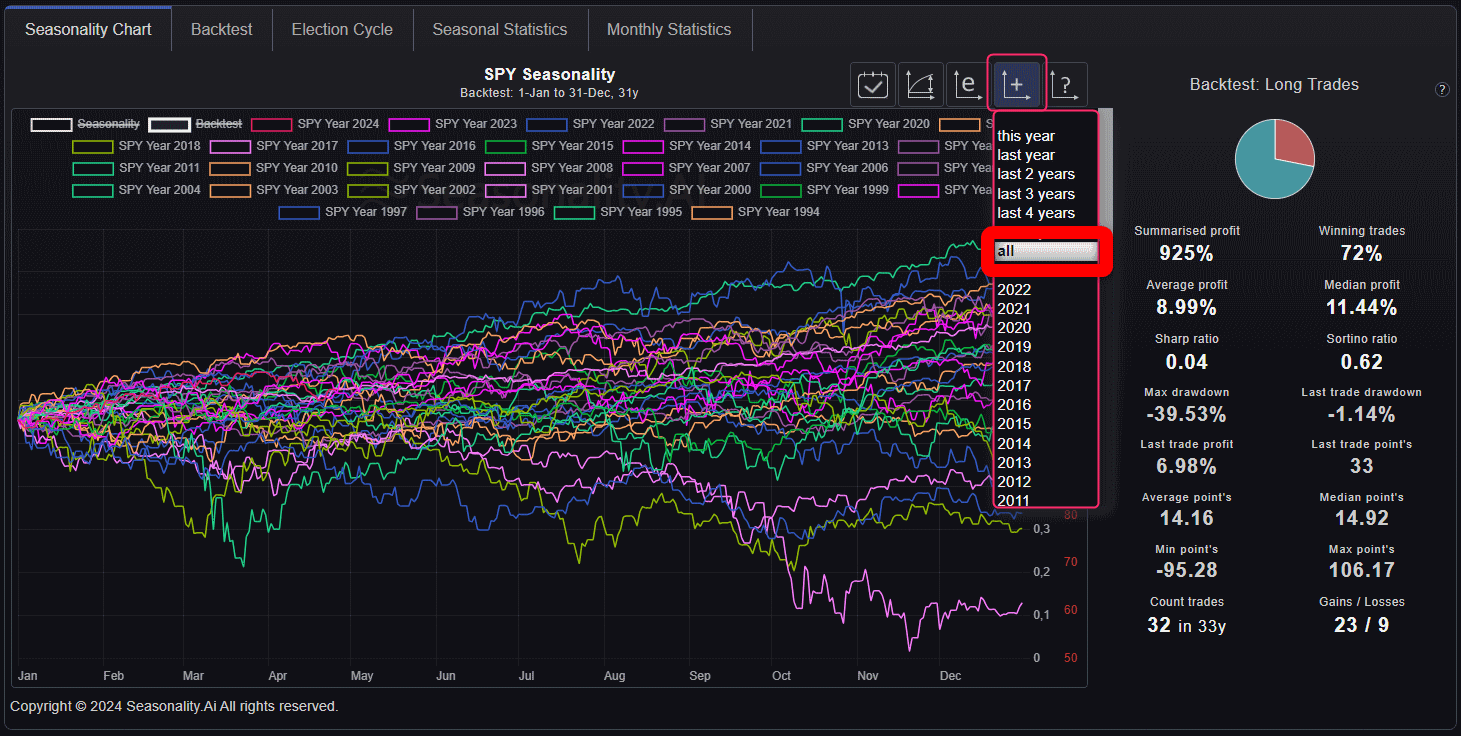 You can display the election cycle seasonality simply by clicking on a button. If you are only interested in one year, you can hide individual lines by clicking on the legend in the chart.